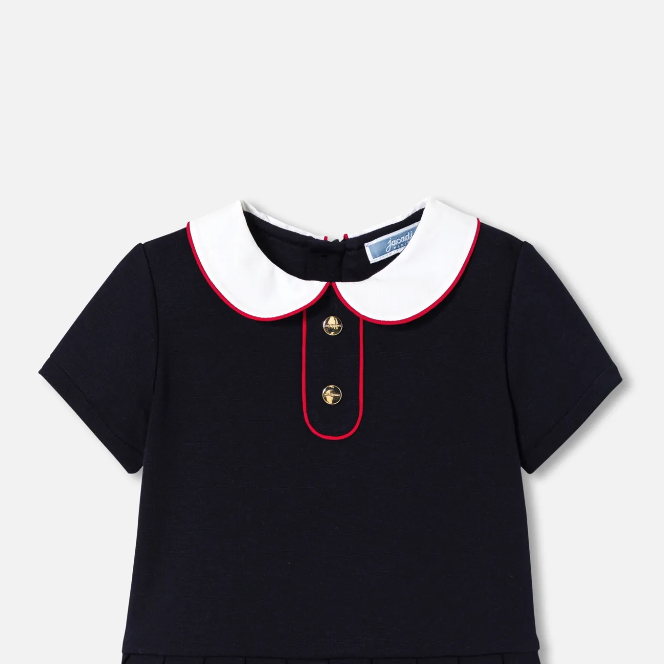 – Détails de biais contrastés au col et sur les pattes boutonnées