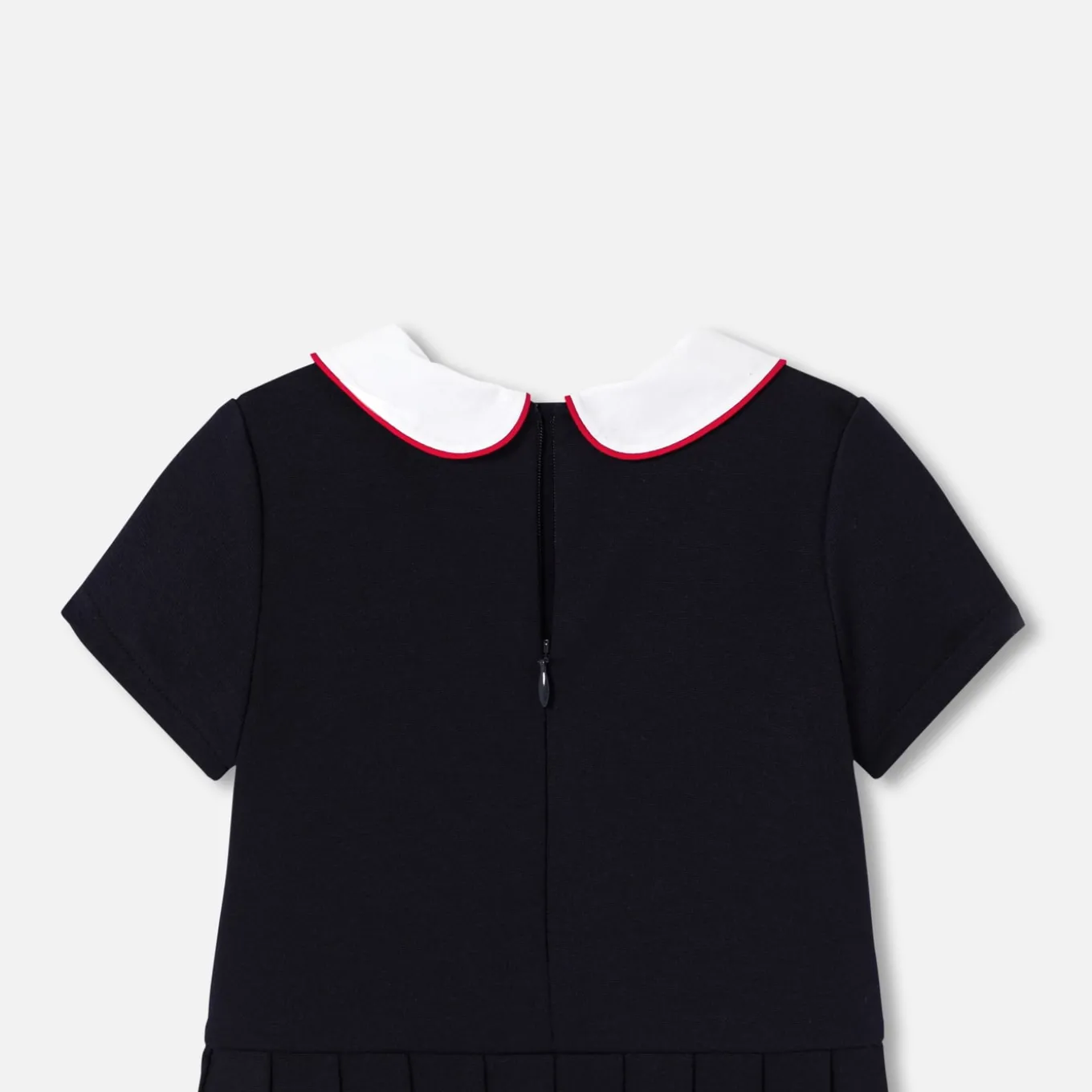 – Détails de biais contrastés au col et sur les pattes boutonnées