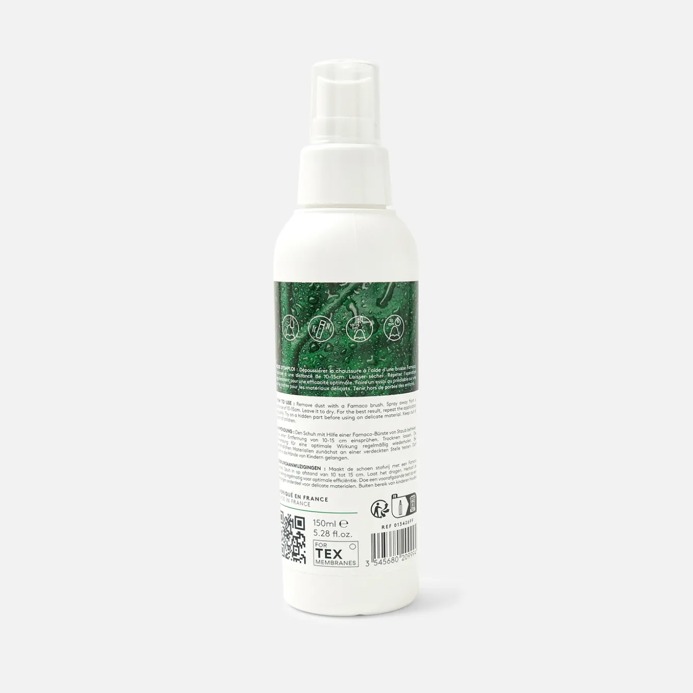 Après dépoussiérage de la chaussure à l’aide d’une brosse Famaco, vaporiser la chaussure à 10-15 cm de hauteur. Laissez sécher pendant au moins 30 minutes avant d’exposer les chaussures à l’eau. Pour un meilleur résultat, répéter l’opération régulièrement. Faire un essai sur une partie cachée.